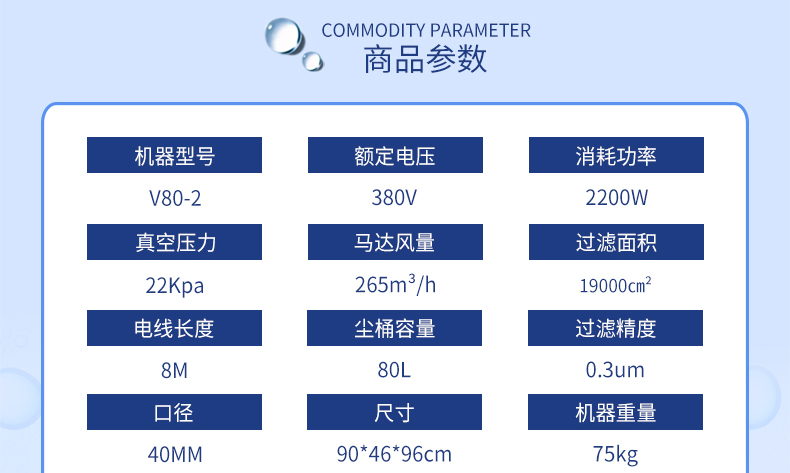 l 耐潔思V80-2是一款工業(yè)吸塵器,機器具有漏電,缺相、過熱及過載保護(hù)裝置,小型的體積適用于工作區(qū)域狹小有不斷有灰塵產(chǎn)生的場所,可固定安裝在大型設(shè)備上作為固定吸塵裝置。適用于各類型清理工作非常繁重的工廠。